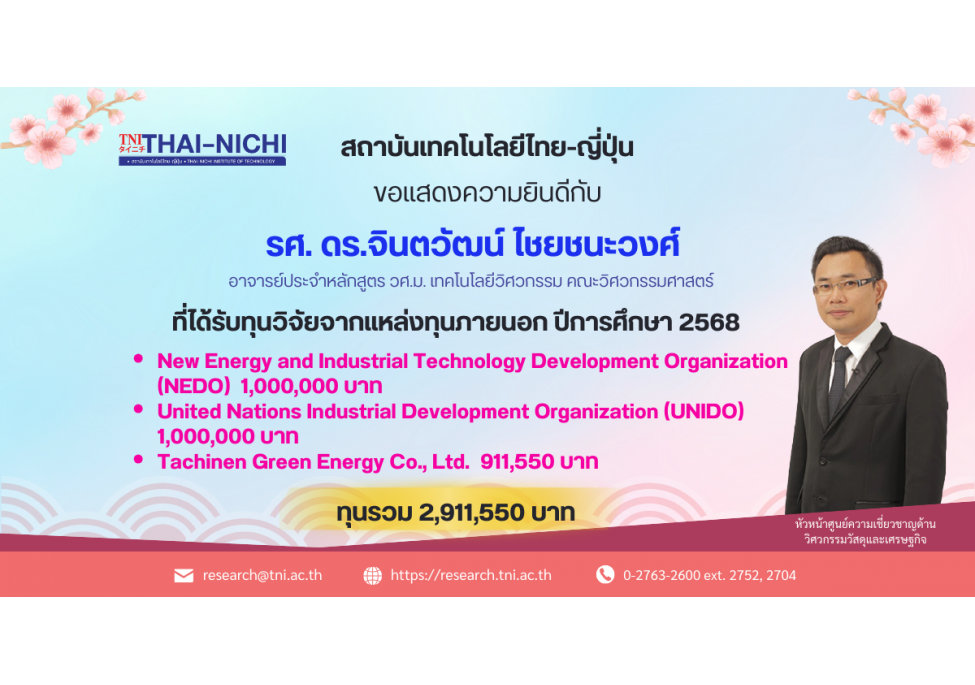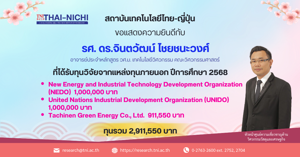 สถาบันเทคโนโลยีไทย-ญี่ปุ่น ขอแสดงความยินดีกับ รศ. ดร.จินตวัฒน์ ไชยชนะวงศ์ อาจารย์ประจำหลักสูตร วศ.ม. เทคโนโลยีวิศวกรรม คณะวิศวกรรมศาสตร์ ที่ได้รับทุนวิจัยจากแหล่งทุนภายนอก ปีการศึกษา 2568