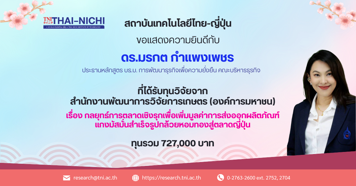 สถาบันเทคโนโลยีไทย-ญี่ปุ่น ขอแสดงความยินดีกับ ดร.มรกต กำแพงเพชร ประธานหลักสูตร บธ.บ. การพัฒนาธุรกิจเพื่อความยั่งยืน คณะบริหารธุรกิจ ที่ได้รับทุนวิจัยจาก สำนักงานพัฒนาการวิจัยการเกษตร (องค์การมหาชน) เรื่อง กลยุทธ์การตลาดเชิงรุกเพื่อเพิ่มมูลค่าการส่งออกผลิตภัณฑ์แกงมัสมั่นสำเร็จรูปกล้วยหอมทองสู่ตลาดญี่ปุ่น จำนวน 727,000 บาท
